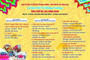 Lễ hội Giỗ Tổ Hùng Vương – Đền thờ Âu Lạc năm 2026 chính thức diễn ra với nhiều hoạt động đặc sắc: dâng hương Quốc Tổ, rước lễ, trò chơi dân gian, biểu diễn nghệ thuật và không gian văn hoá truyền thống.